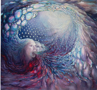 This painting reveals how deeply entrenched in the process I was: I had unconsciously become the architypal ouroborus of ancient hermetic writings. It also shows how my head has mataphorically taken on the form of a pearl in a shell through the continual aggravation of the grit of my life. All our destructive emotions have to burn themselves out and be suffered through, whilst also participation in the reality of the outer world, if true trasformation is to be achieved.